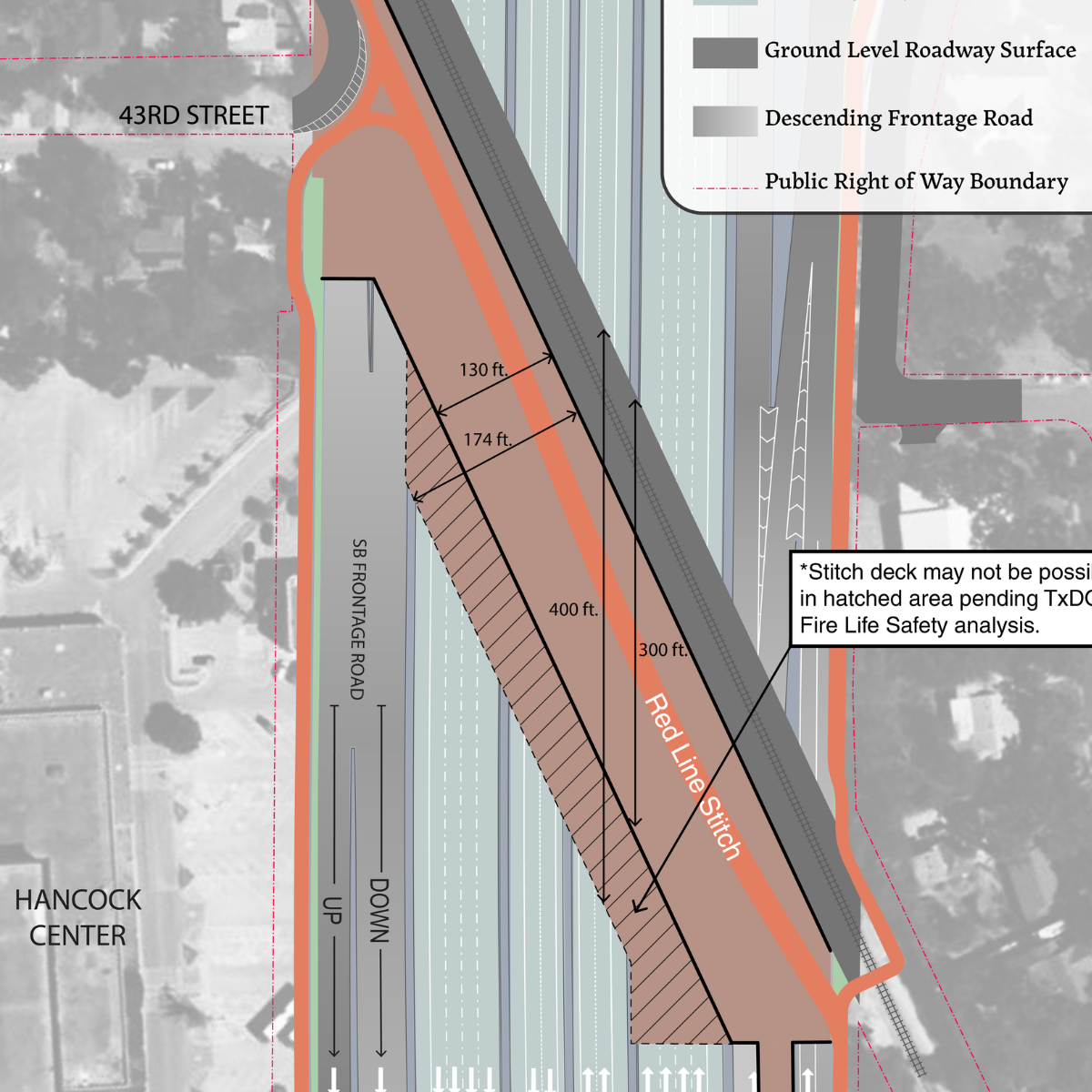 The four Northern Stitch concept options are available on the City of Austin Our Future 35 website. Even upon a quick review of the four options, it's evident that Option A and B are the only two that provide a full stitch for the Red Line Parkway. Options C and D provide a partial stitch that exposes Parkway users to the major negative impacts from the highway below.